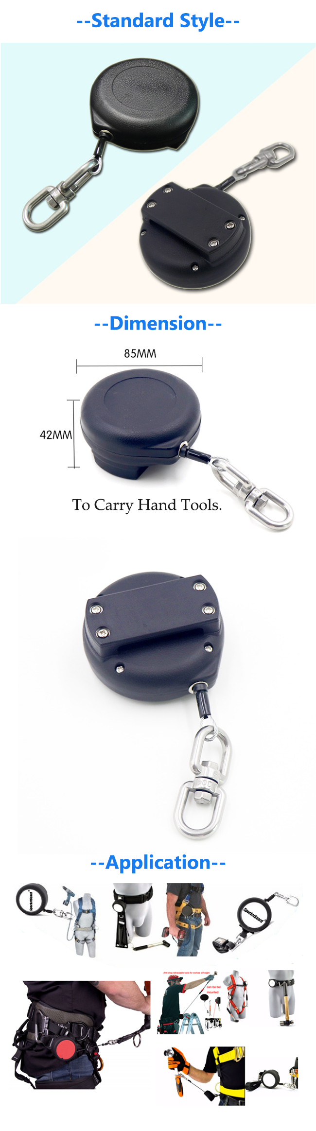 The Quick-stop fall-arrest retractable tool lanyard provides safety device for workers who work at height, fitted with swivel, carabiner, belt, harness and so on, dictate that lanyards be used to secure all hand tools from falling. That special efficient fall arrest system give safety to all hand tools as well as to the workers themselves at height, at the same time, it offers all of the functionality of a non-retractable with some other conveniences other types of lanyards do not offer.